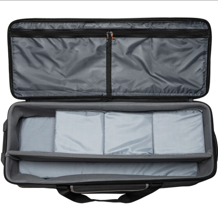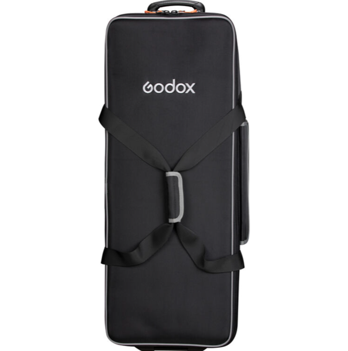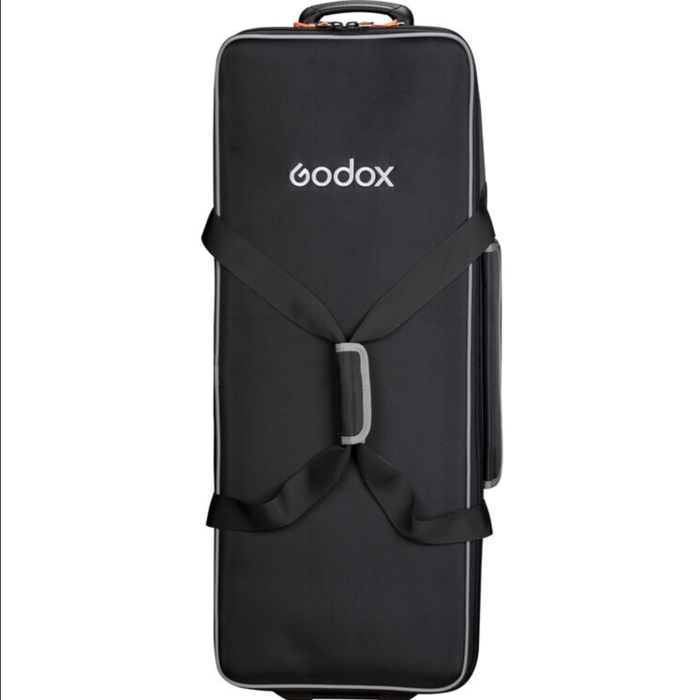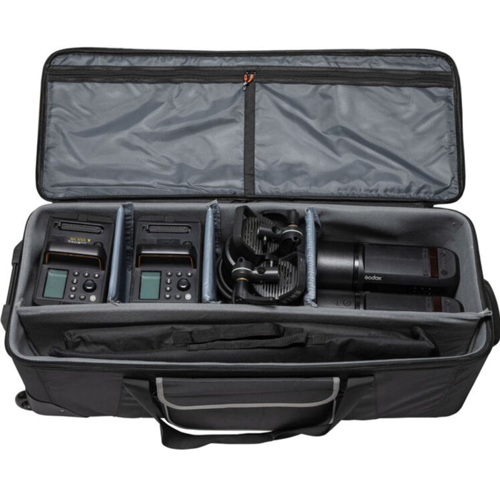 The CB-06 Hard Carrying Case with Wheels from Godox can hold a three-light kit with accessories. It has a similar design to that of travel suitcases, with inline skate wheels and a top handle that allow you to easily roll the bag along on smooth surfaces. For short distances, straps on each side of the bag can be connected via a detachable grip for simple hand carrying.