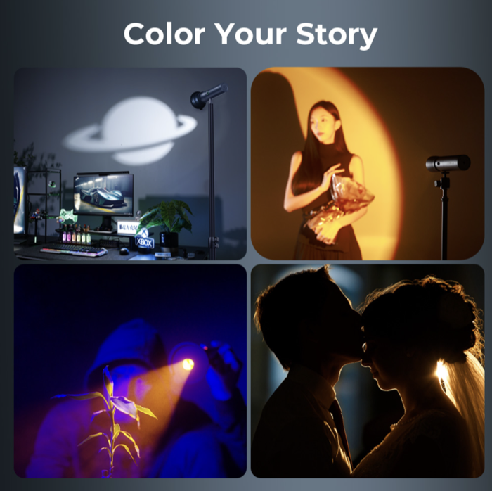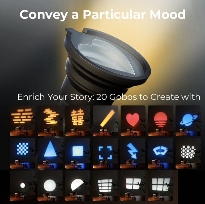 20 filters to shape light: Includes 20 filters and 4-color LED beads for diverse atmospheric effects and creative flexibility, and slide-adjustable lens controls light coverage (10°-60).