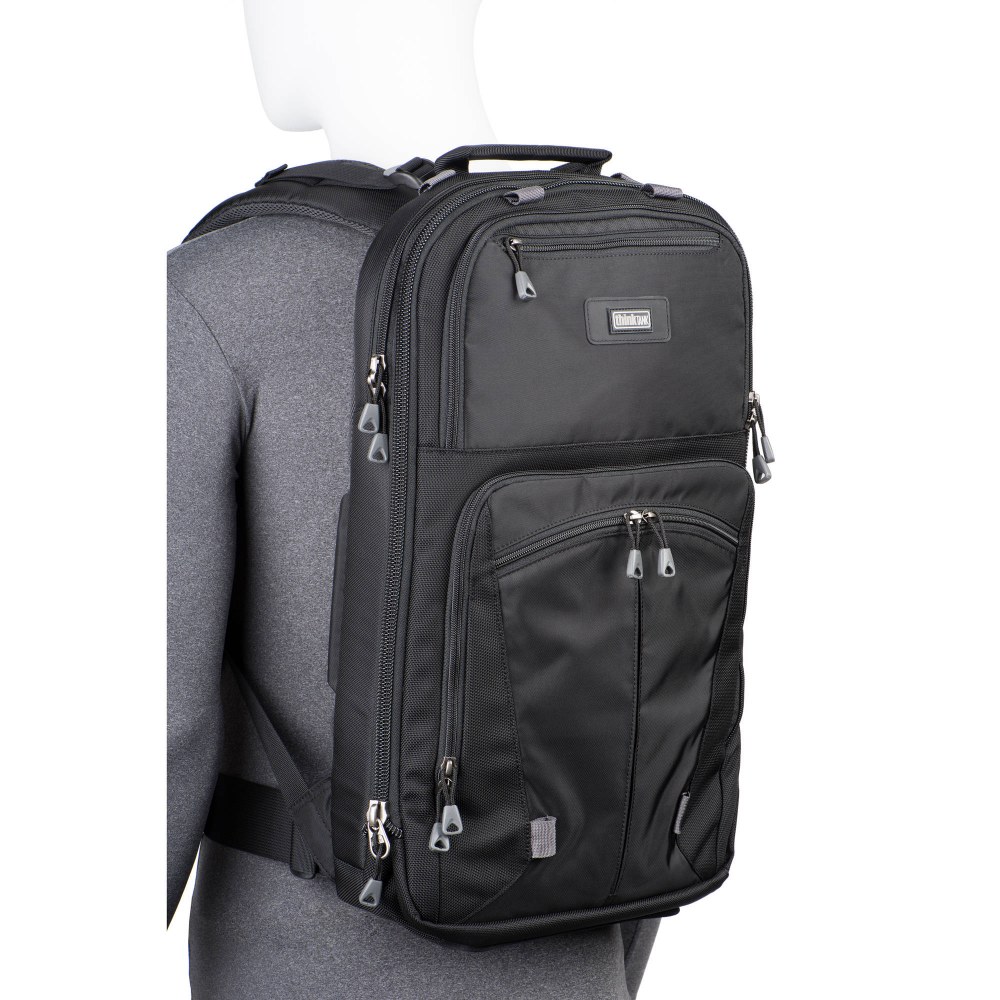 Bring two gripped or un-gripped DSLRs, four detached lenses, related accessories, an up to 17" laptop, a tablet, and personal items on your next photo adventure with the black Shape Shifter 17 V2.0 Backpack from Think Tank. The Shape Shifter gets its name from the ability to save space by compressing to a depth of only 3" when empty. The pack features separate laptop and tablet compartments, and a spacious, zippered main compartment with neoprene pockets and wraps to store, protect, and organize gear. On the front exterior of the pack is a pocket for the base of a small tripod, and adjustable straps to secure the upper and lower sections. Additional storage is provided by exterior pockets, organizer panel, and a plush pocket for a cell phone with an up to 5.5" display.